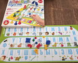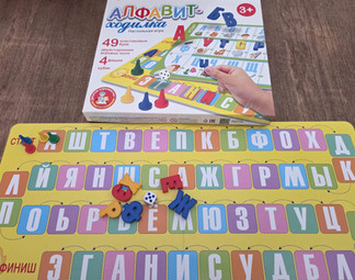 Настолка-бродилка с ярким игровым полем для изучения букв. Дети учат алфавит, перемещаясь по клеткам и называя слова и буквы.